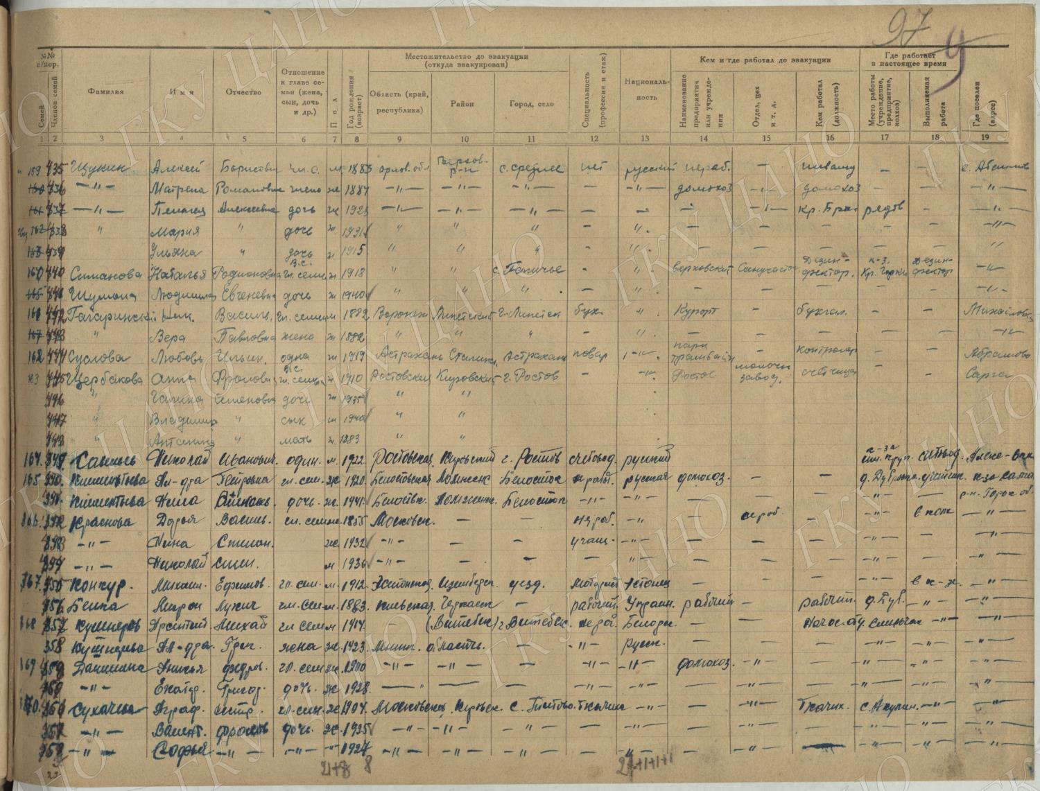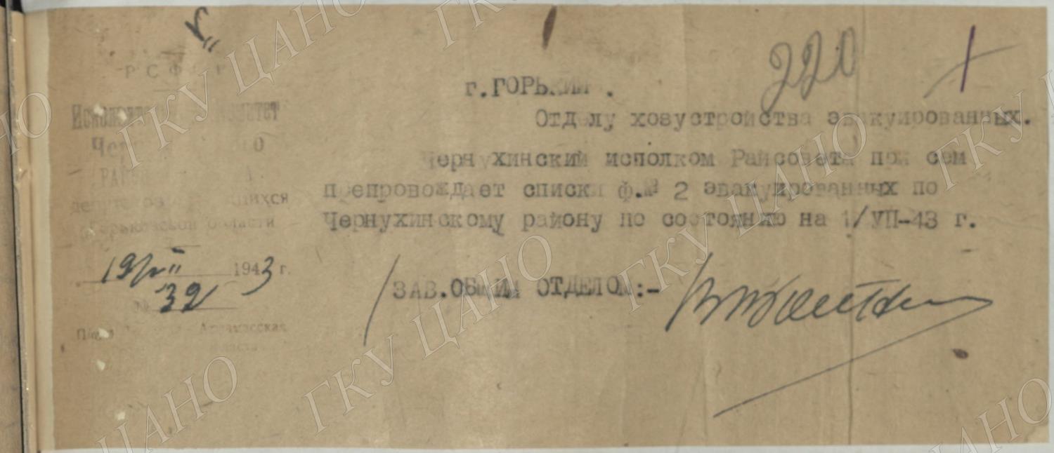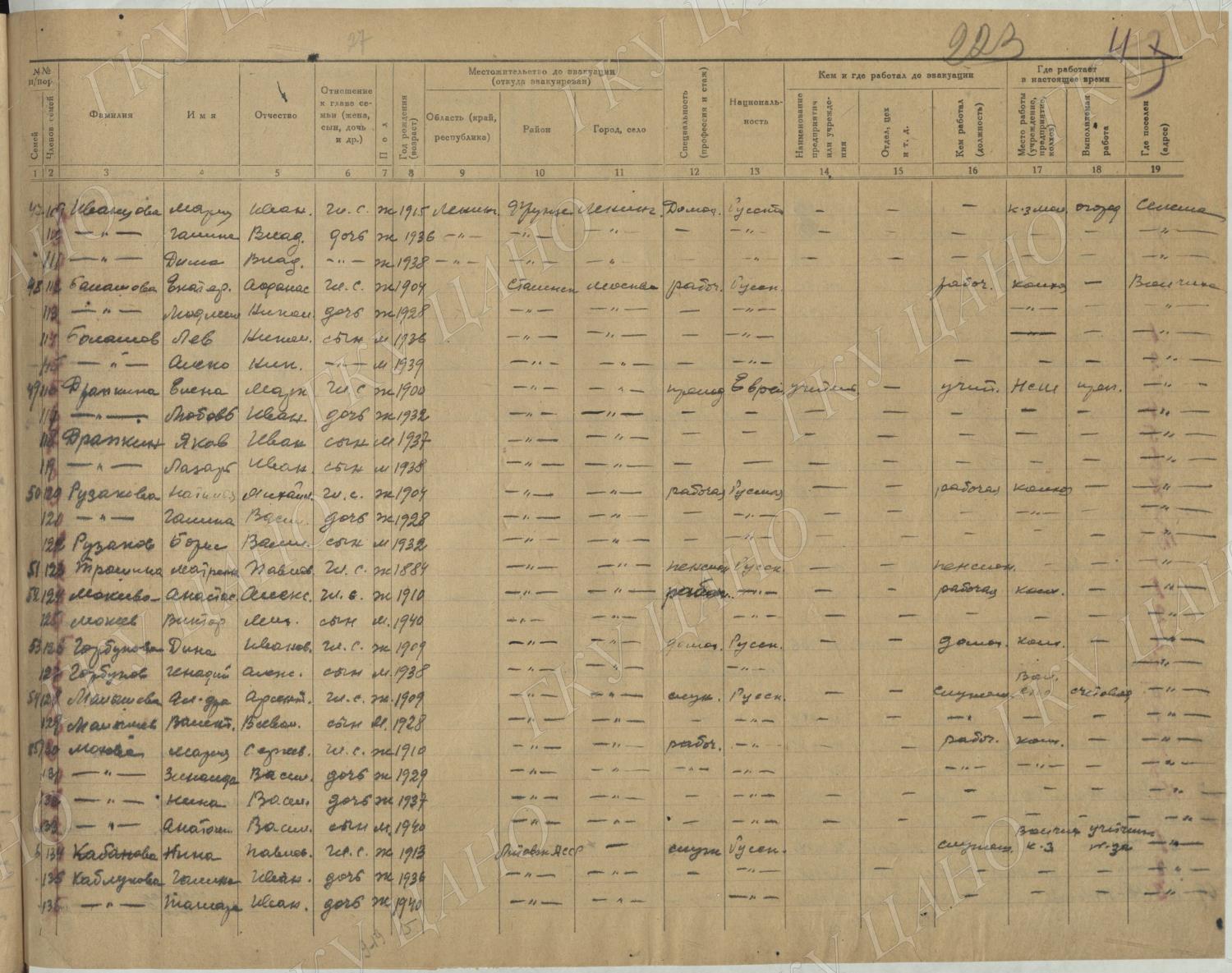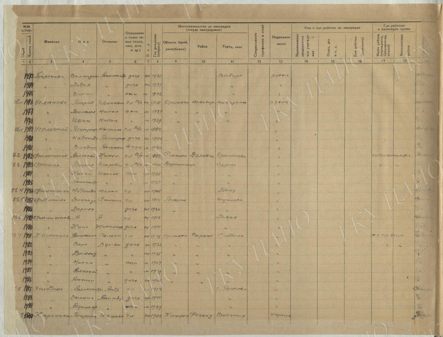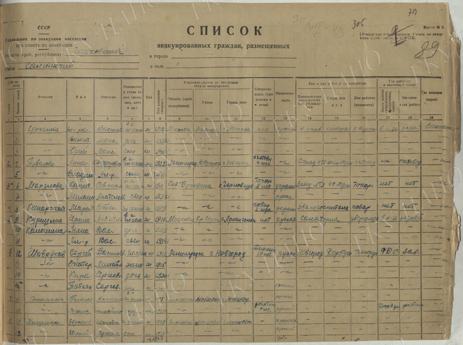 Ф. Р-5344. Оп. 1. Д. 78. Списки эвакуированных граждан, размещенных в городах и районах Горьковской области (Салганский, Сергачский, Сосновский, Теплостанский, Тоншаевский, Чернухинский, Чкаловский, Шахунский, Шарангский районы). 1 июня — 16 октября 1943