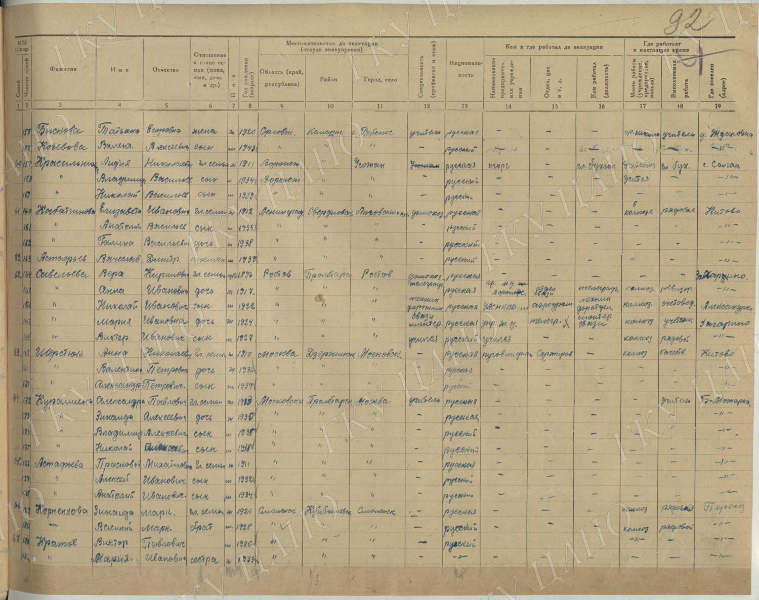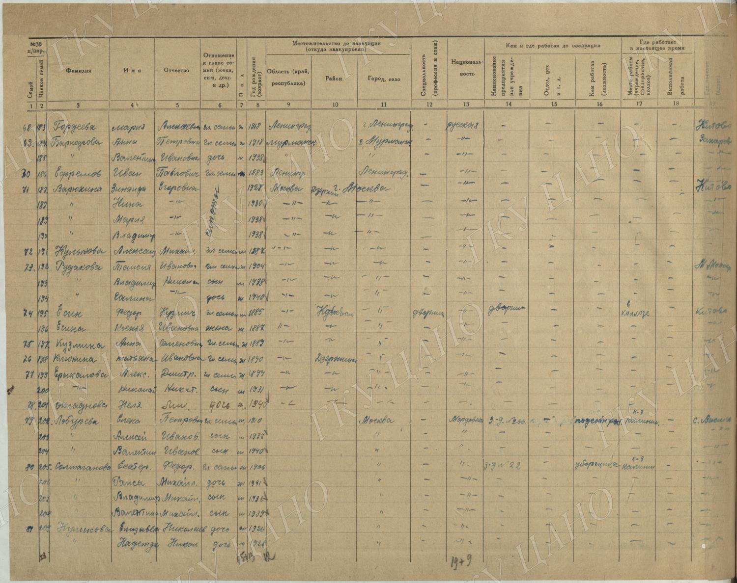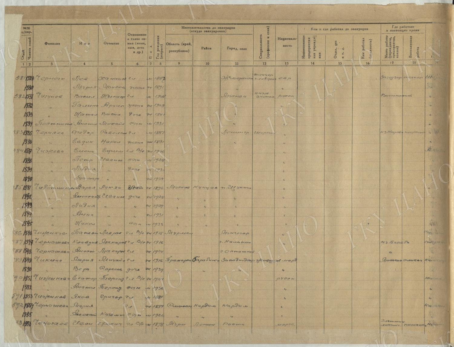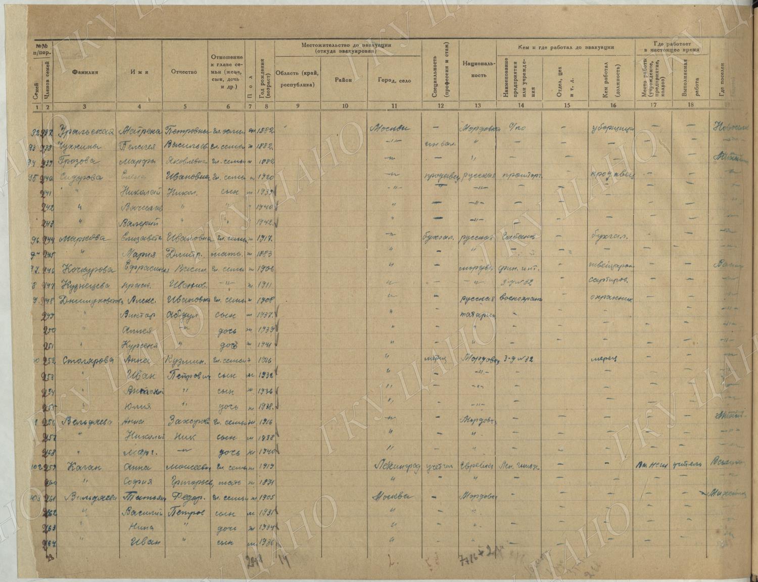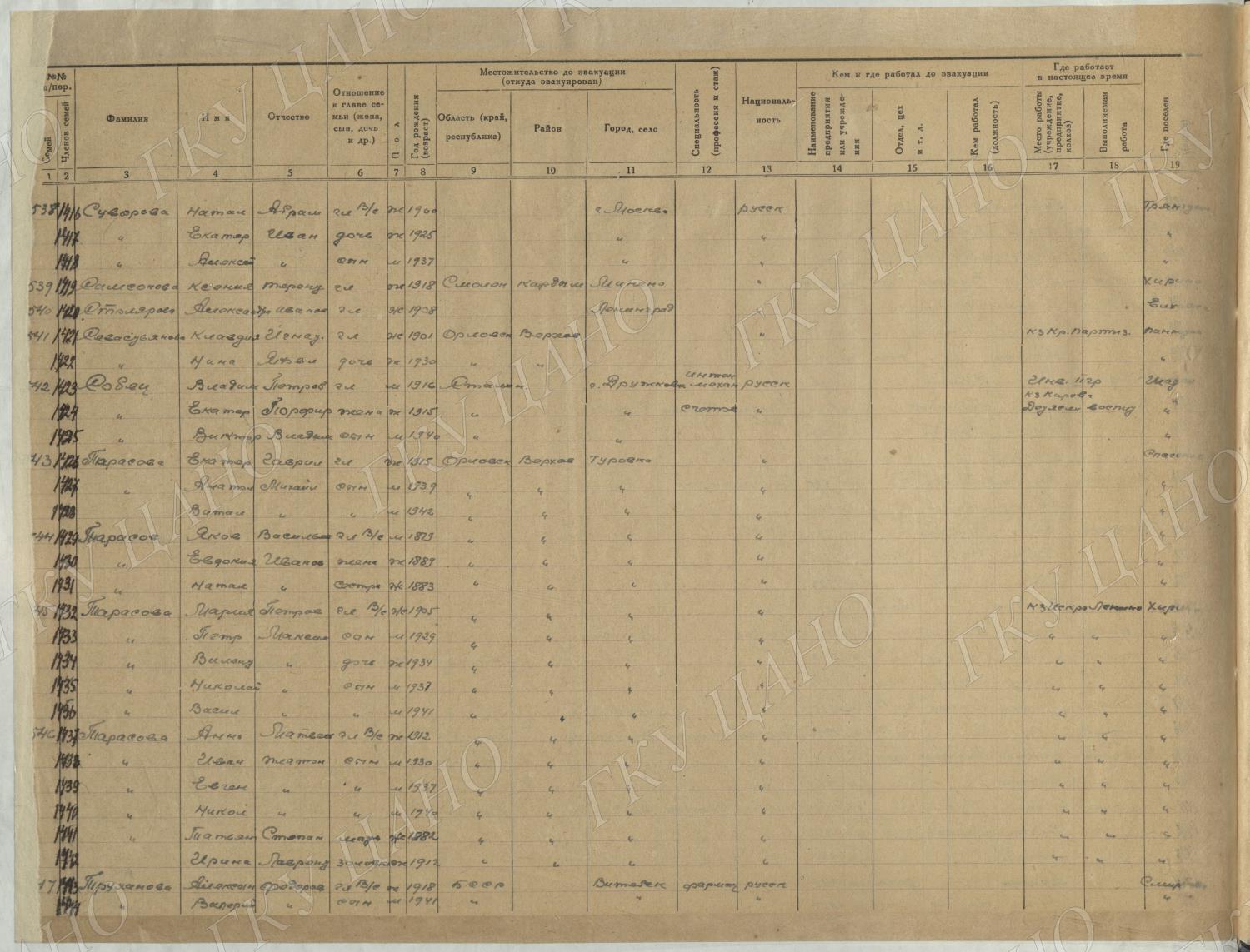 Ф. Р-5344. Оп. 1. Д. 78. Списки эвакуированных граждан, размещенных в городах и районах Горьковской области (Салганский, Сергачский, Сосновский, Теплостанский, Тоншаевский, Чернухинский, Чкаловский, Шахунский, Шарангский районы). 1 июня — 16 октября 1943