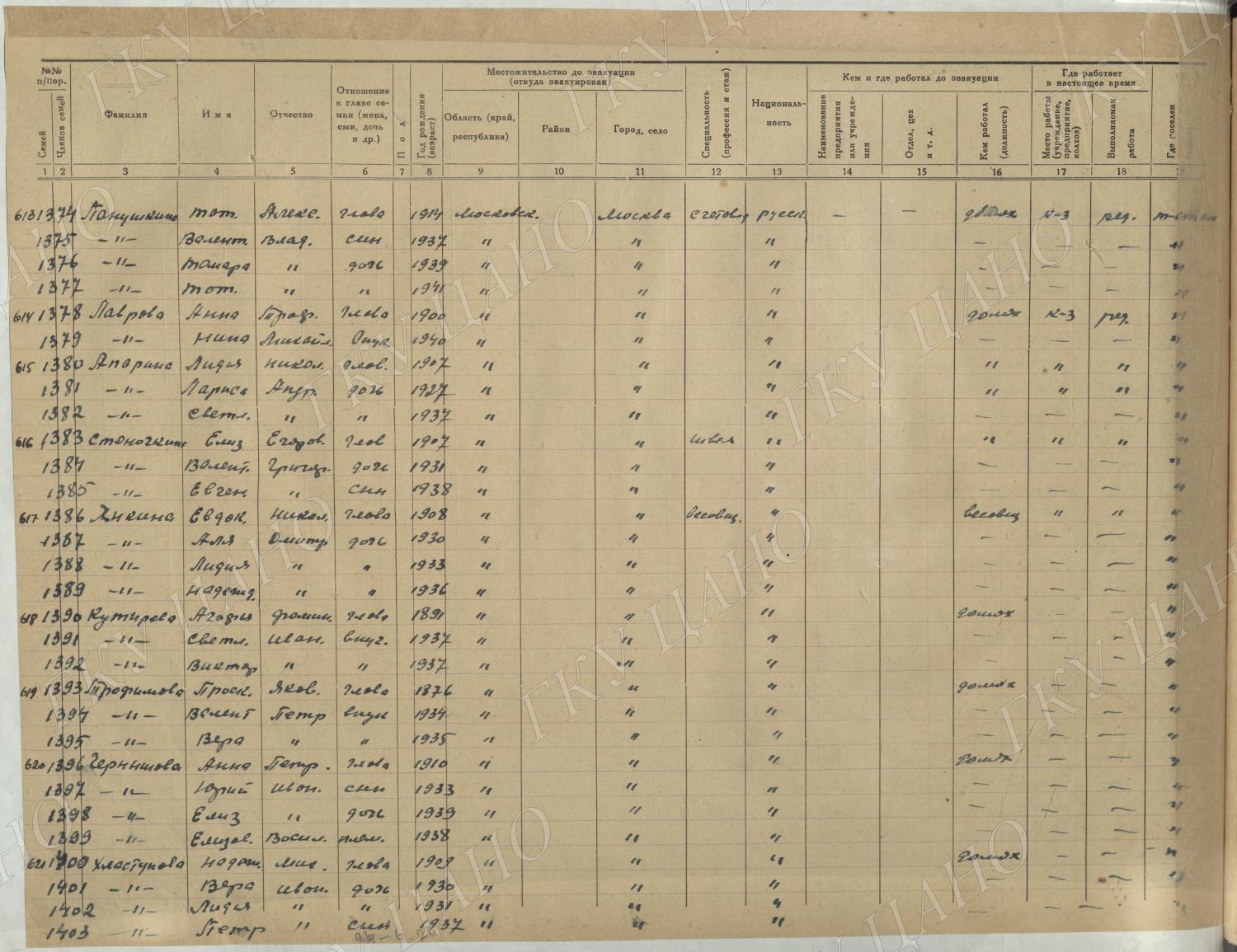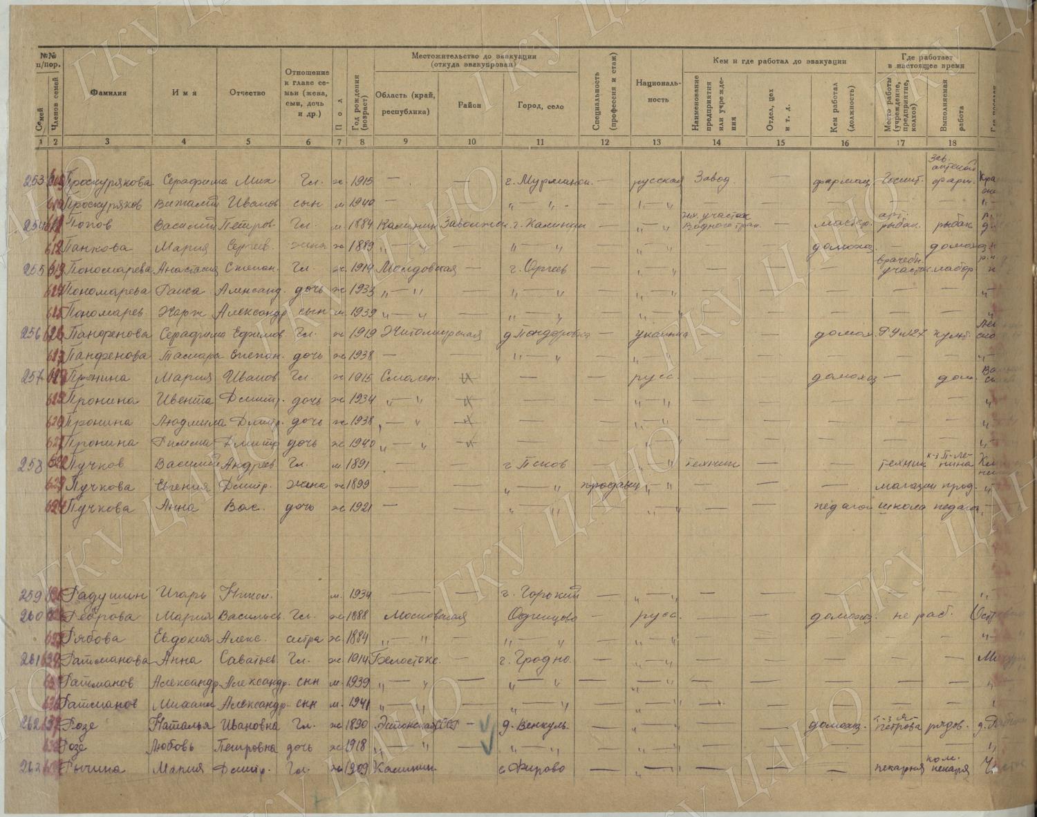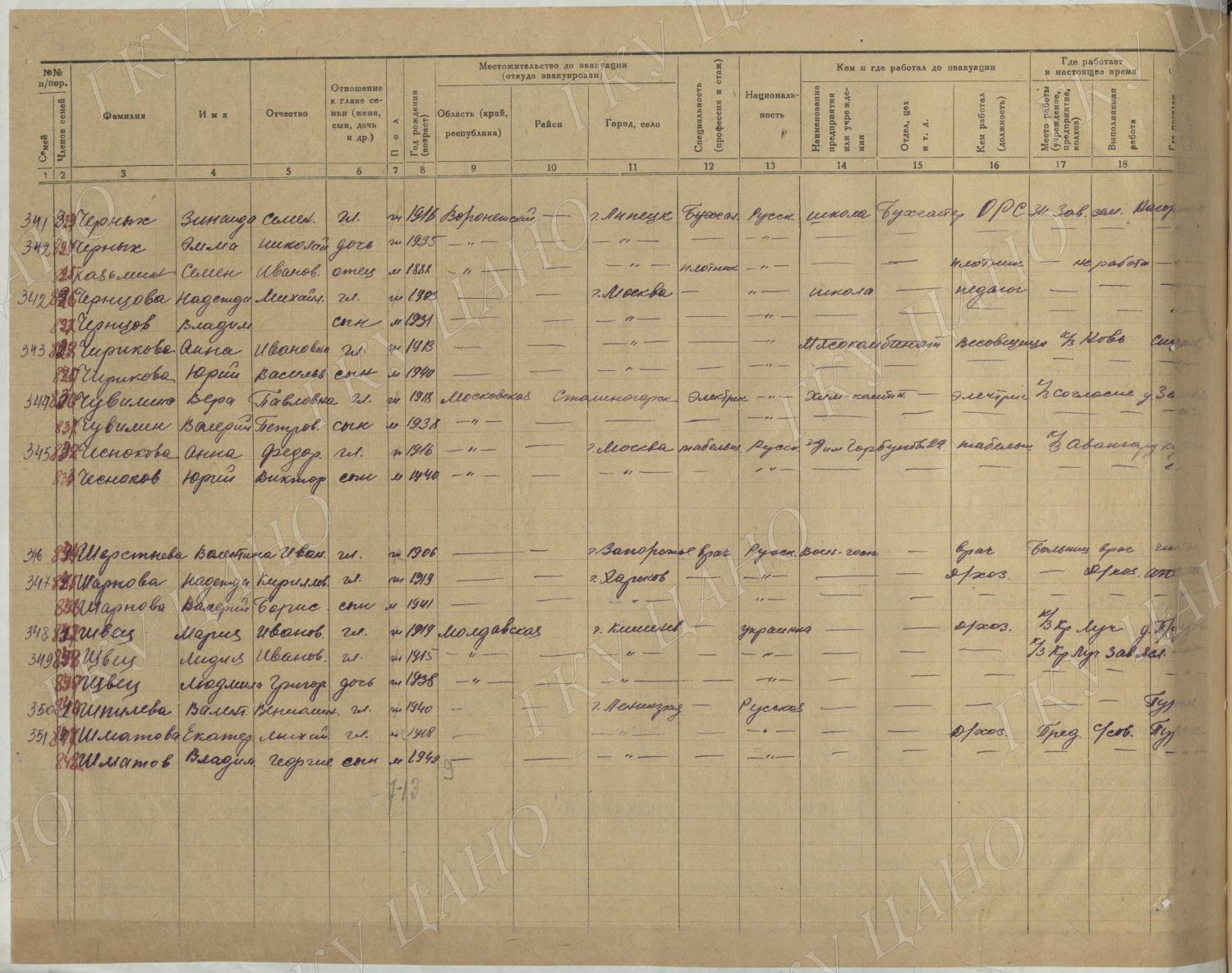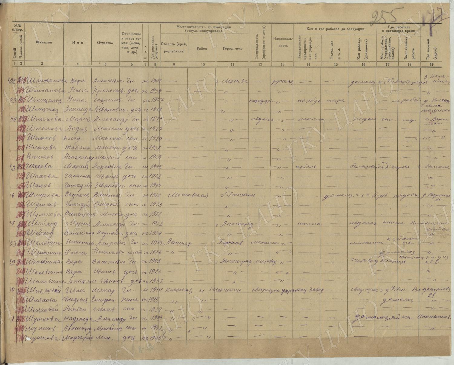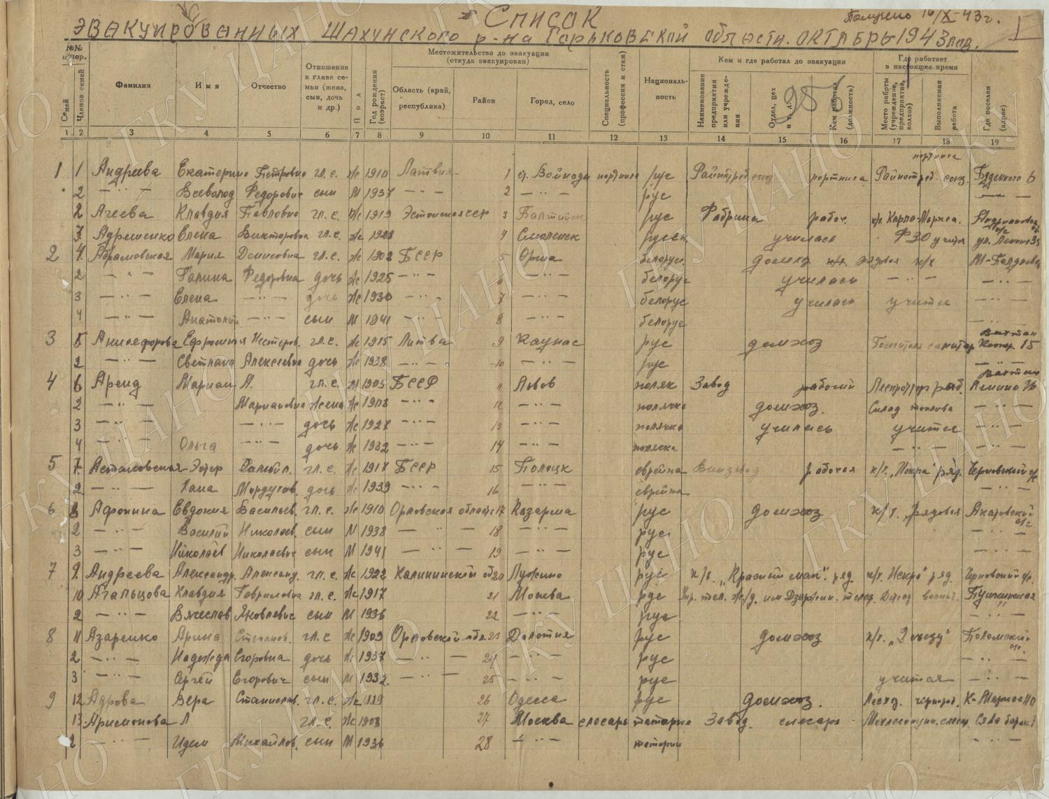 Ф. Р-5344. Оп. 1. Д. 78. Списки эвакуированных граждан, размещенных в городах и районах Горьковской области (Салганский, Сергачский, Сосновский, Теплостанский, Тоншаевский, Чернухинский, Чкаловский, Шахунский, Шарангский районы). 1 июня — 16 октября 1943