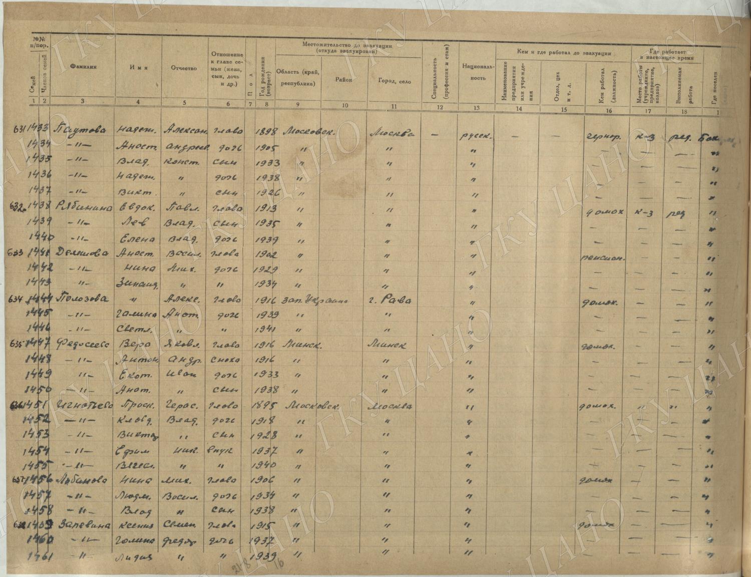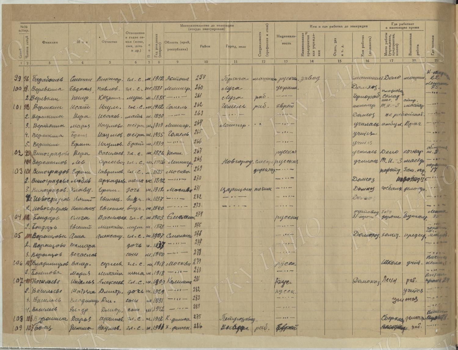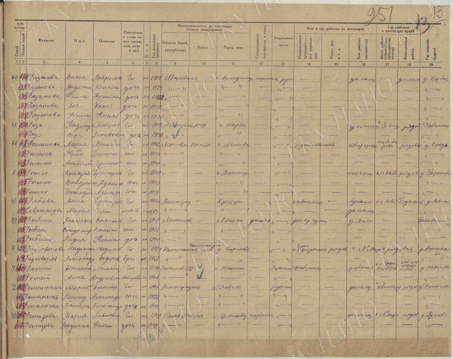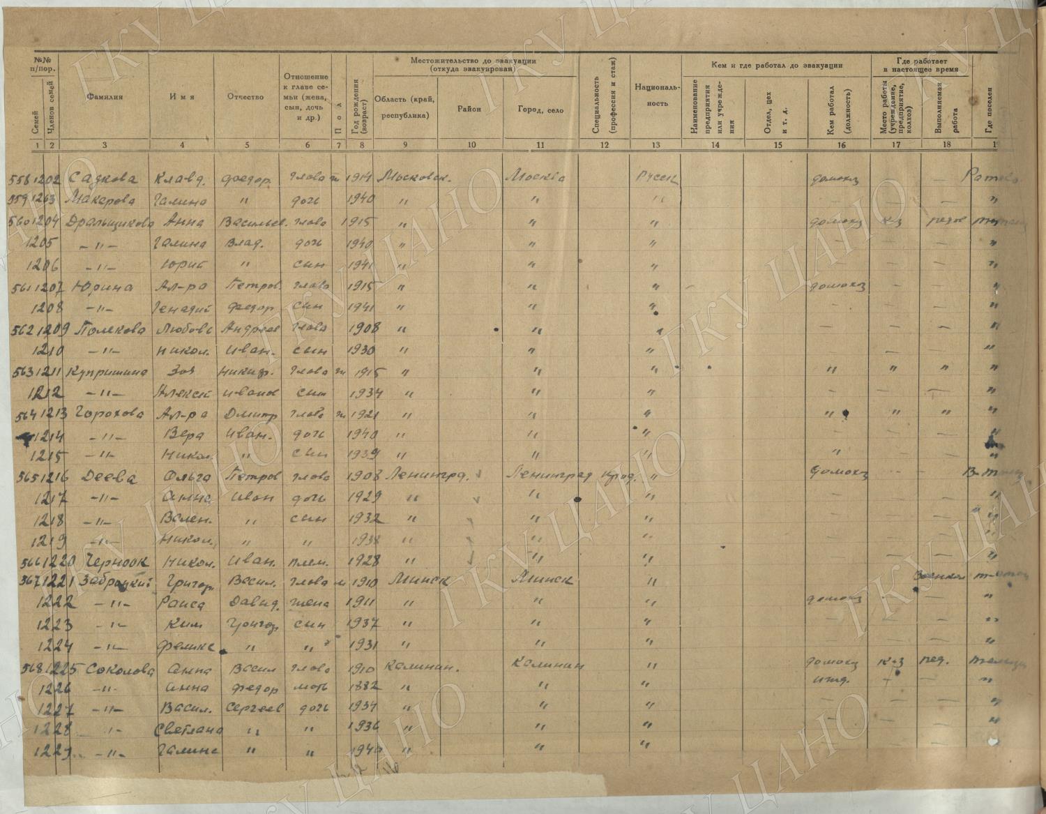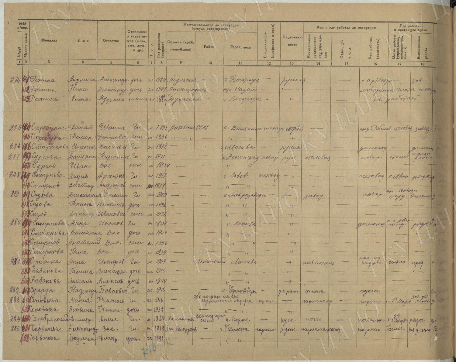Ф. Р-5344. Оп. 1. Д. 78. Списки эвакуированных граждан, размещенных в городах и районах Горьковской области (Салганский, Сергачский, Сосновский, Теплостанский, Тоншаевский, Чернухинский, Чкаловский, Шахунский, Шарангский районы). 1 июня — 16 октября 1943