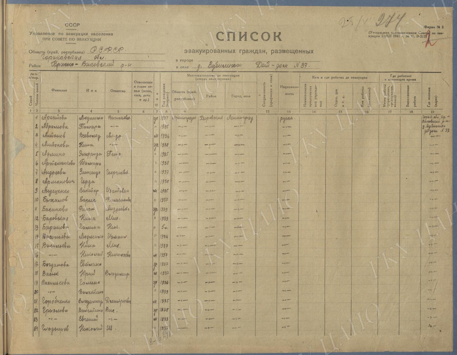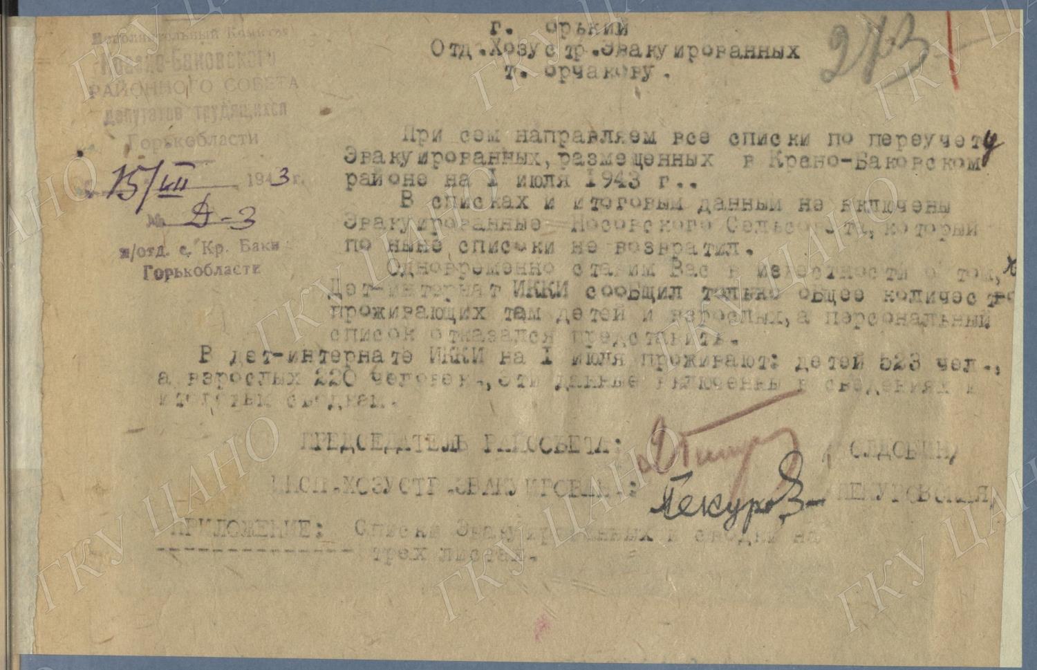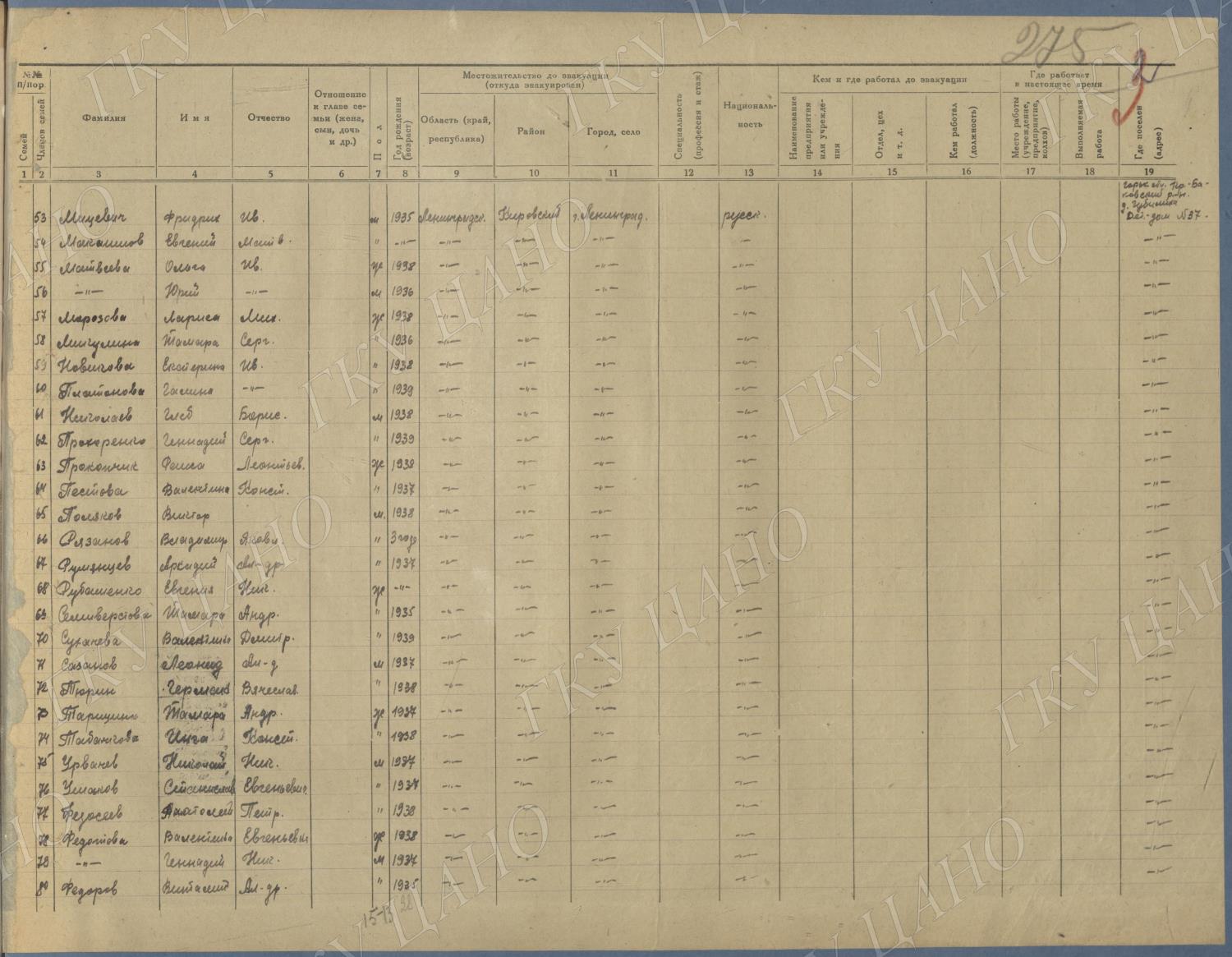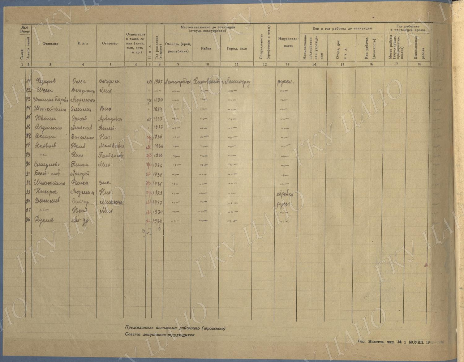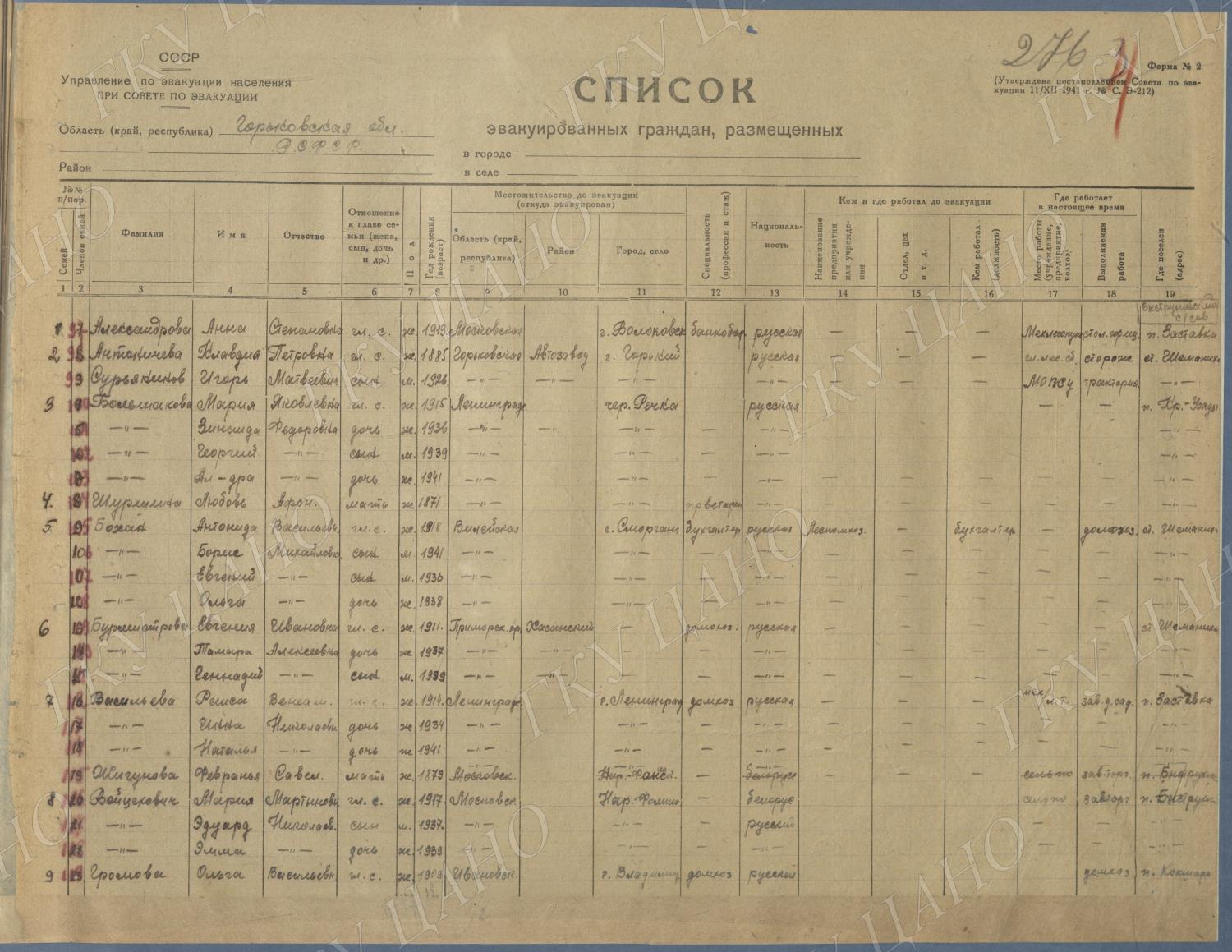 Ф. Р-5344. Оп. 1. Д. 81. Списки эвакуированных граждан, размещенных в городах и районах Горьковской области (районы на буквы «Г» — «К»). 15 июня — 6 августа 1943 г.